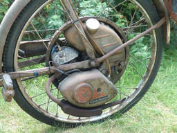 If BMW’s C1 represents the top end of the motorcycle technology spectrum, the Cyclemaster represents the bottom end. Of course, a period of nearly fifty years of technological development separates these two iconic machines, so this is no great surprise. The Cyclemaster wasn’t a complete motorcycle: it was a petrol engine embedded in a bicycle wheel. The Cyclemaster design originated in the Nertherlands in the 1940s. A huge number of Cyclemaster engines were produced in the 1950s, and supplied to various manufacturers to fit in their frames. My Cyclemaster machine was made by Mercury: an obscure British bicycle manufacturer which produced Cyclemaster-based motorcycles in the early 50s.