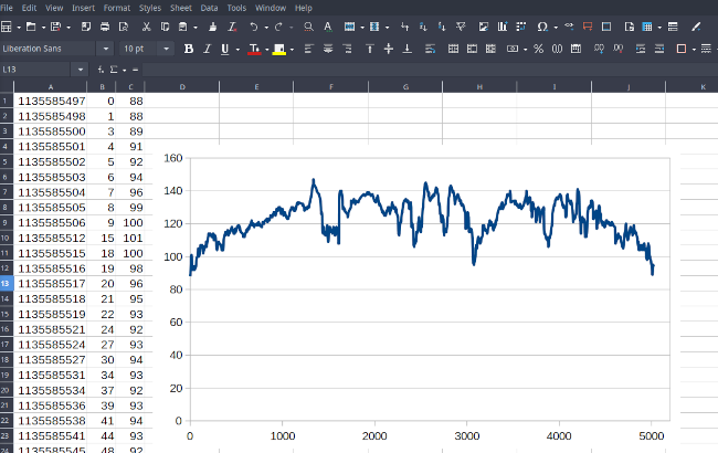 This works because, when recording activities, the watch stores the timestamp and the heart rate in the same row, in positions 5 and 11 respectively. So this filter operation gives me a CSV file with only two columns: timestamp and heart rate. I can load these directly into LibreOffice, and plot them as an XY chart.